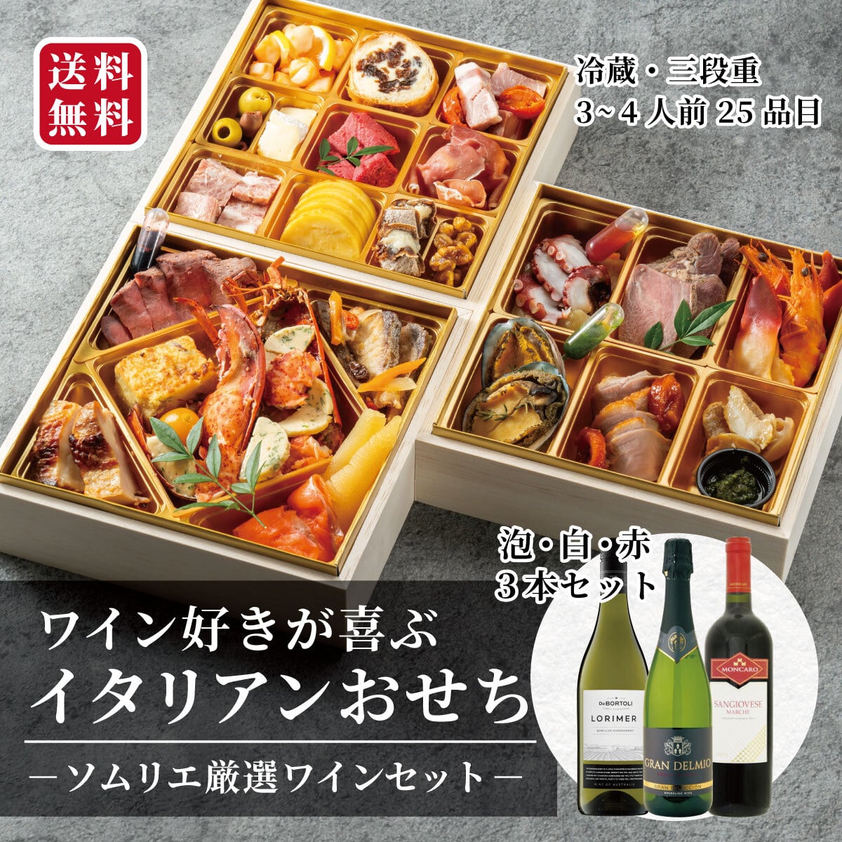 イタリアンおせち豪華三段重&おすすめワイン3本セット【送料無料&早割り】※12/30か31お届け